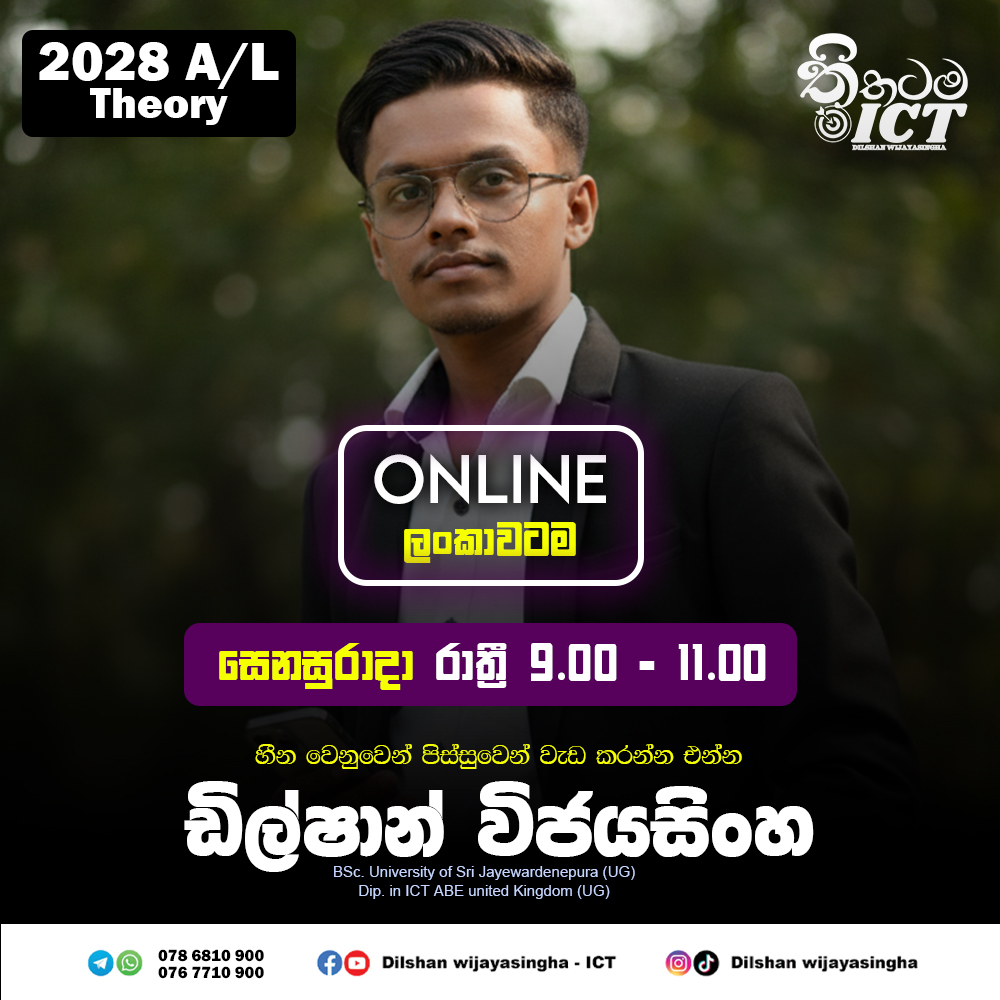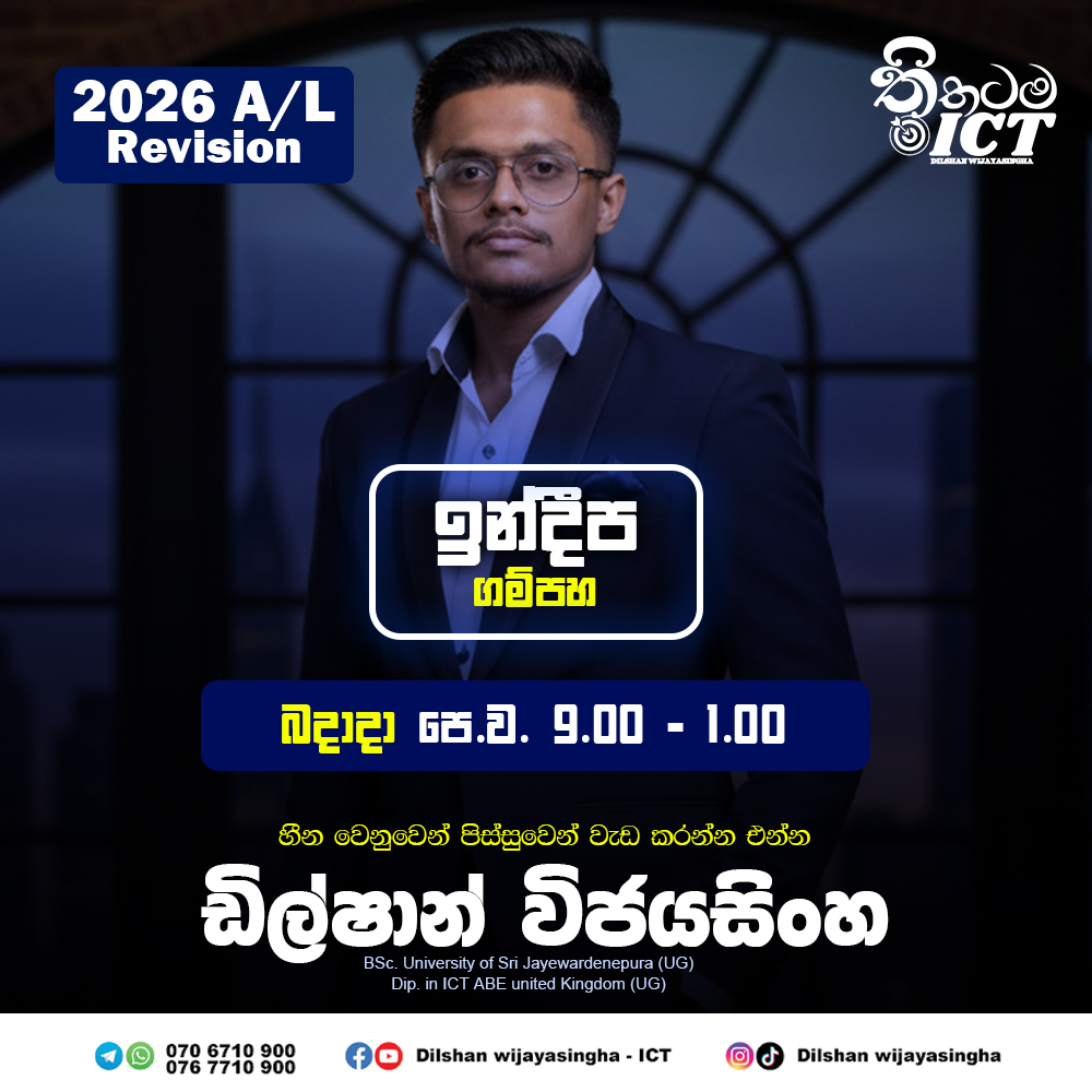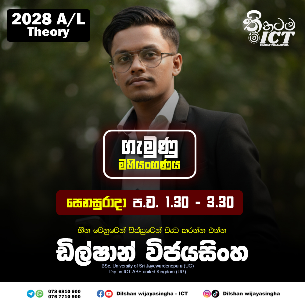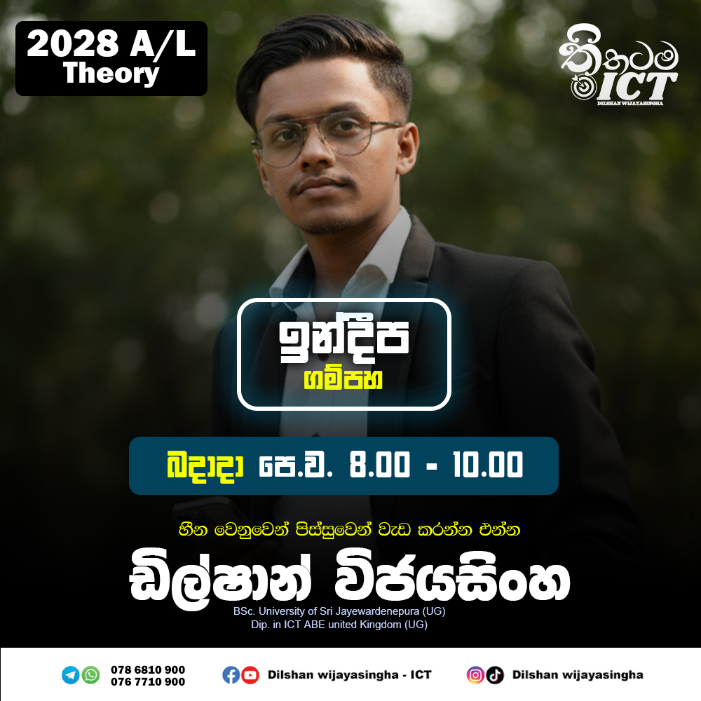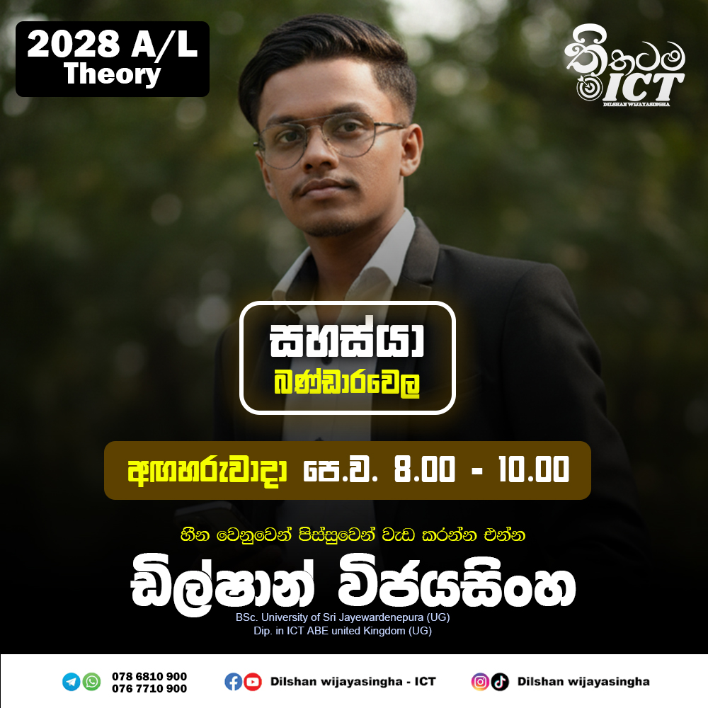 අමාරු ICT විෂය කරුණු සරල සහ කෙටි ක්රම මගින් ආවරණය කරමින්, පසුගිය ප්රශ්න පත්ර,මොඩල් ප්රශ්න පත්ර යොදාගනිමින් පන්තිය තුලදී මෙම ගැටලු නිරාකරණය කරමින් විභාගයට අවශ්ය දැනුමෙන් ඔබ සන්නද්ධ කිරීම ඔහුගේ අරමුණයි.